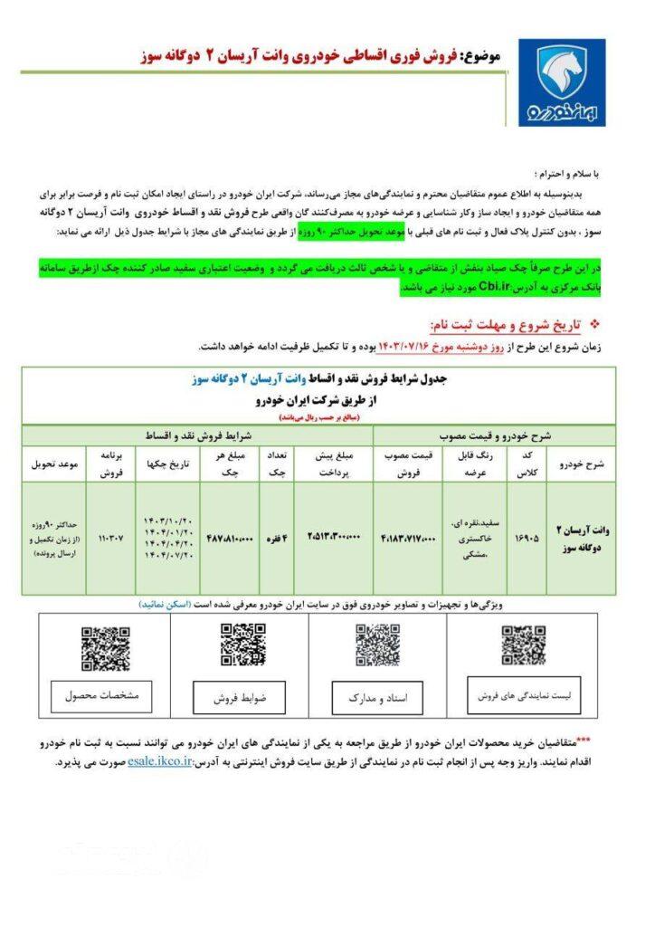 گفتنی است که طرح فروش اقساطی وانت آریسان ۲ از روز دوشنبه ۱۶ مهر آغاز و تا زمان تکمیل ظرفیت ادامه خواهد داشت.