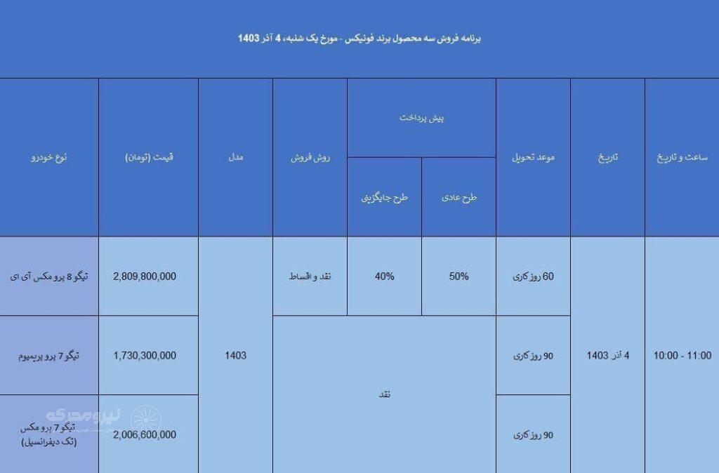 به گزارش نیرومحرکه، در جدیدترین برنامه فروش فونیکس امکان خرید تیگو۷ پرو پرمیوم و تیگو۷ پرومکس صرفا به صورت نقدی و با موعد تحویل ۹۰ روز کاری وجود دارد. در مورد قیمت تیگو۷ پرو پرمیوم باید گفت که این خودرو یک میلیارد و ۷۳۰ میلیون و ۳۰۰ هزار تومان قیمت دارد؛ تیگو۷ پرومکس که نسخه قوی تر تیگو۷ پرو پرمیوم محسوب می شود نیز با قیمت دو میلیارد و شش میلیون و ۶۰۰ هزار تومان عرضه می شود.