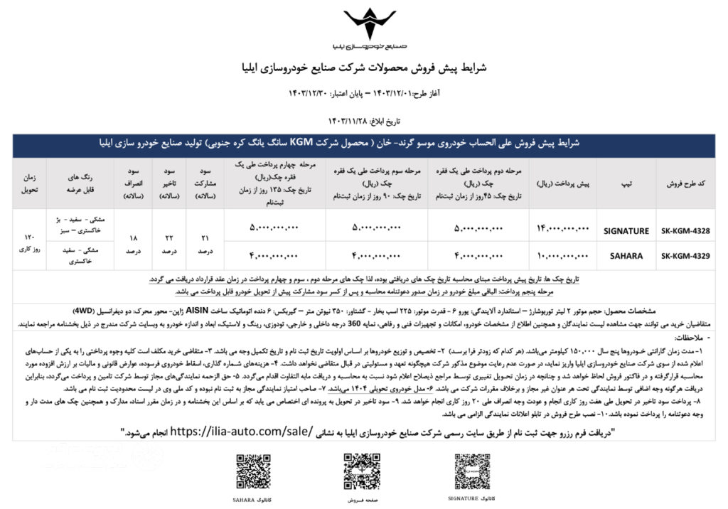 معاون بازاریابی و فروش خودروسازی ایلیا اعلام کرد: با توجه به استقبال متقاضیان از جدیدترین محصول کرهای این خودروسازی، شرایط فروش پیکاپ موسو گرند- خان در دو تیپ SIGNATURE و SAHARA با زمان تحویل ۱۲۰ روز کاری آغاز شد.