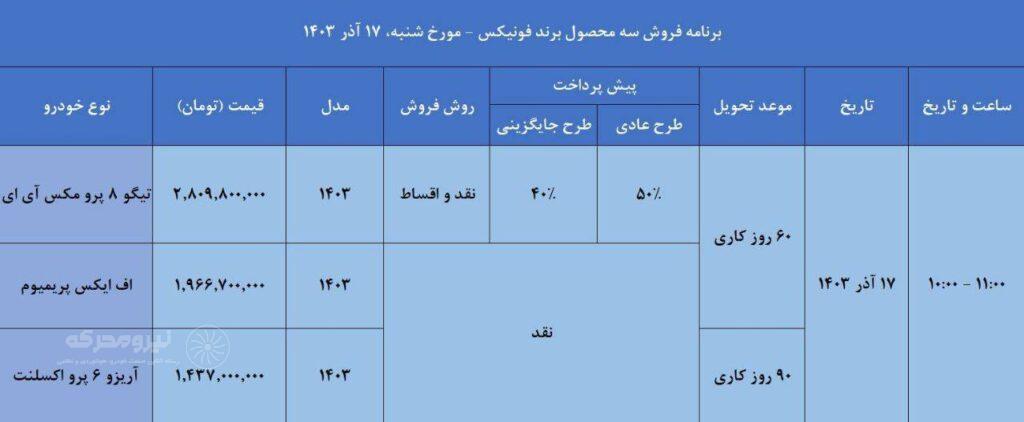 به گزارش نیرومحرکه، شرکت مدیران خودرو از ساعت ۱۰ صبح روز شنبه ۱۷ آذرماه فروش محصولات فونیکس را آغاز خواهد کرد. در جدیدترین طرح فروش محصولات برند فونیکس از گروه مدیران خودرو، خودروهای آریزو۶ پرو، اف ایکس و تیگو۸ پرومکس IE عرضه خواهند شد. شایان ذکر است که در جدیدترین طرح فروش فونیکس، خودروهای اف ایکس پرمیوم و آریزو۶ پرو به صورت نقدی عرضه شده و صرفا امکان خرید اقساطی تیگو۸ پرومکس IE با پیش پرداخت های ۴۰ و ۵۰ درصدی وجود دارد.