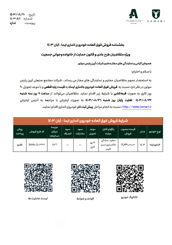 خریداران میتوانند با مراجعه به بخش فروش سایت رسمی لاماری به آدرسhttps://sales.lamari.ir/ از ساعت ۹ صبح روز سهشنبه، ۲۲/۰۸/۱۴۰۳ تا روز شنبه، ۲۶/۰۸/۱۴۰۳ و انجام مراحل پیش ثبتنام، درخواست خود را برای خرید این خودروی پرطرفدار و محبوب ثبت کنند.